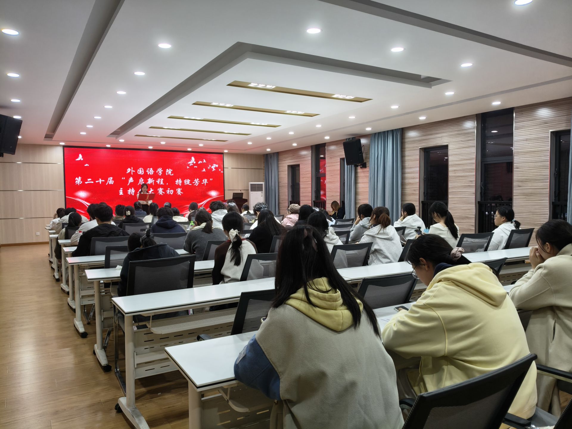 10月22日,8818www威尼斯第二十届“声启新程,持绽芳华”主持人大赛初赛于逸夫楼5306教室顺利拉开帷幕。本次比赛旨在丰富校园文化生活,发掘与培养学生主持人才,展现外院学子的卓越风采。马进、曹媛媛两位老师受邀担任比赛评委。