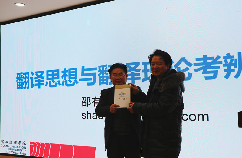 邵有学追溯了翻译思想研究形成的沿革,重点分析了“翻译思想”在中国的萌芽、发展、繁盛的三个时期;并从词典的定义、专业辞典的定义、广义和狭义的“翻译思想”三个方面辨析和界定了翻译思想和翻译理论的概念。他提出翻译思想研究不仅要包括有代表性的翻译家个人的思想,还要注重描述影响一个时代翻译活动、群体理论研究的思想潮流;翻译思想的研究包括决定翻译理论研究取向、指导翻译策略选择的个体内在价值观和翻译活动的历史决定因素这两个方面。邵教授随后分享了撰写《翻译思想与翻译理论考辨》论文的经历,并赠予学院其本人学术专著《中国翻译思想史新论》。该报告专业性、学术性很强,在与会人员中产生了强烈的反响。