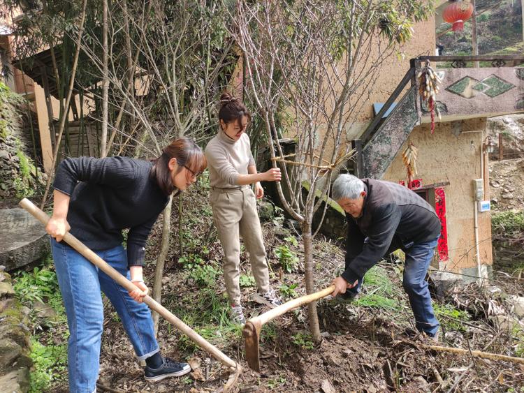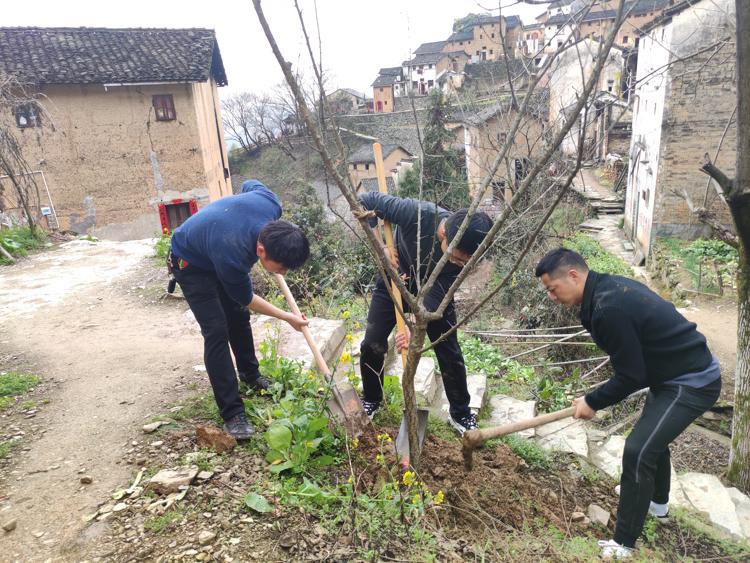植树活动现场,大家三五成群、两三一组,扶树正苗、挥锹培土,铲土填坑、踩实浇水,衔接有序、相互配合,呈现一派热火朝天的景象。经过一个上午的辛勤劳动,大家在阳产村规划的种植地点种下红梅、樱花、枫树等观赏树苗18棵。小树苗在春日的暖阳中昂首挺立,为生机盎然的春天增添了新的希望。