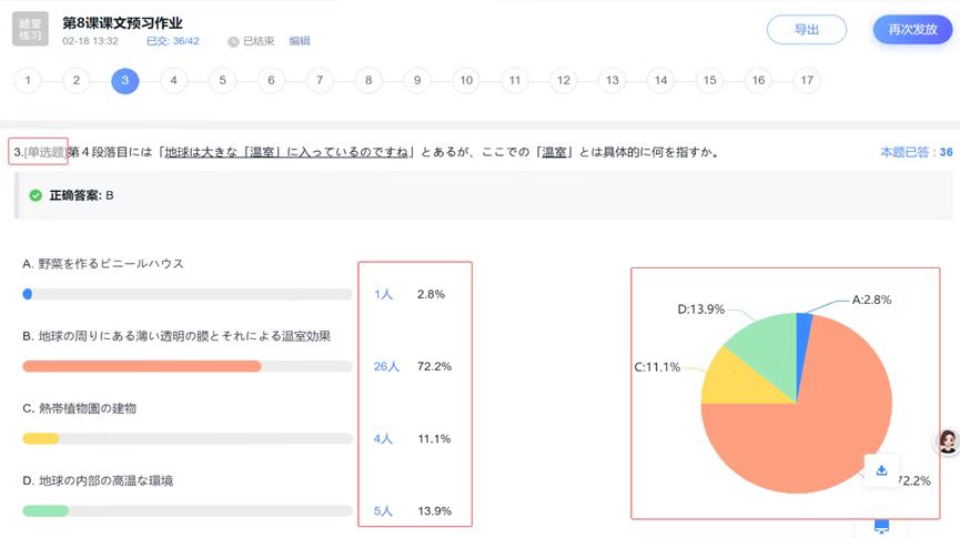 课堂教学中,李艳通过单词听写检测词汇掌握情况,并结合学习通后台数据分析,对错误率较高的题目进行重点讲解,实现精准教学。值得一提的是,课程巧妙融入课程思政元素。例如,在讲授第八课关于地球温室气体的内容时,引导学生思考“我国在应对气候变化方面采取了哪些切实有效的措施”,激发学生的民族自豪感与社会责任感,促进专业知识学习与国家发展战略的有机融合。